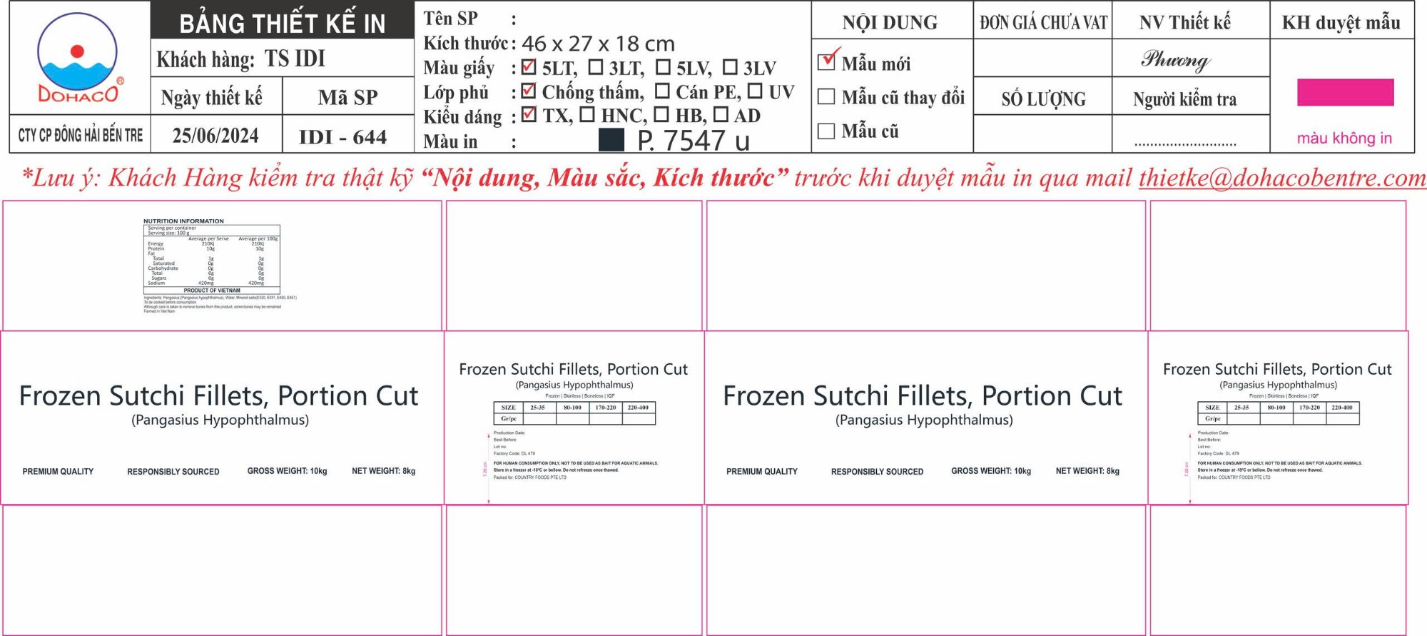 | 3 | Thùng xếp, giấy trắng 5 lớp, chống thấm 2 mặt, in Flexo, thùng trắng in thông tin, FROZEN SUTCHI FILLET, PORTION CUT KT: 46 x 27 x 18 cm, MS: 644 | DHC | Thùng | 1.400
