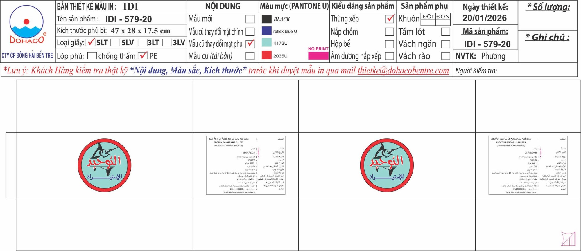 Thùng xếp, giấy trắng 5 lớp, chống thấm, cán màng, in Flexo, Thùng logo con cá ả rập, IQF, 5kgx2, net 95%, MS: 579-20 KT: 47 x 28 x 17.5 cm