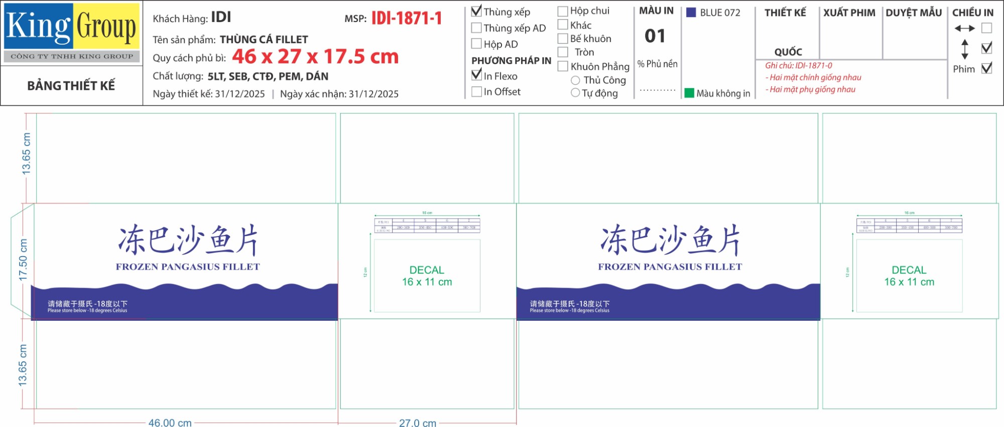 Thùng xếp, giấy trắng 5 lớp, chống thấm, CÁN MÀNG, in flexo, thùng logo HY mới, NỀN BLUE KT: 46 x 27 x 17.5 cm (Cá fillet – net 100% - 280-340g – bulk 8.8kg – mb dưới 8%) MS: 1871-1