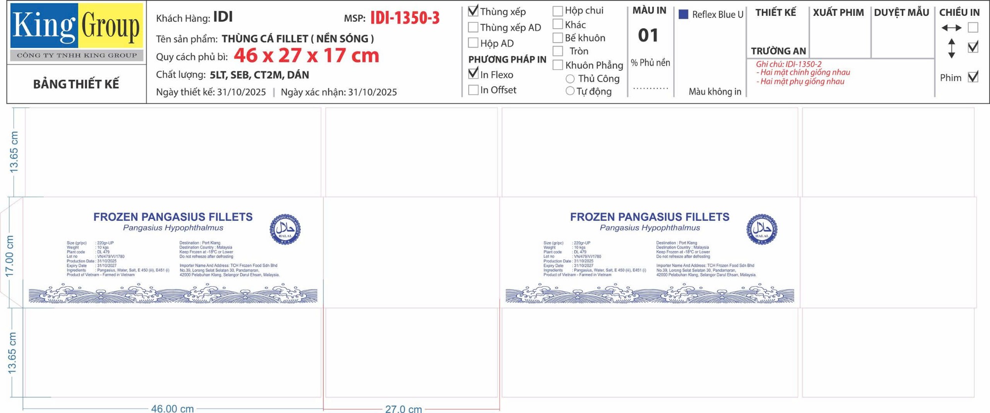Thùng xếp, giấy trắng, 5 lớp, chống thấm 2 mặt, chất lượng tốt, in flexo ,Thùng FROZEN PANGASIUS FILLETs, bulk 10KG, thùng tin thông tin màu xanh MS : 1350-3, kt: 46 x 27 x 17 |