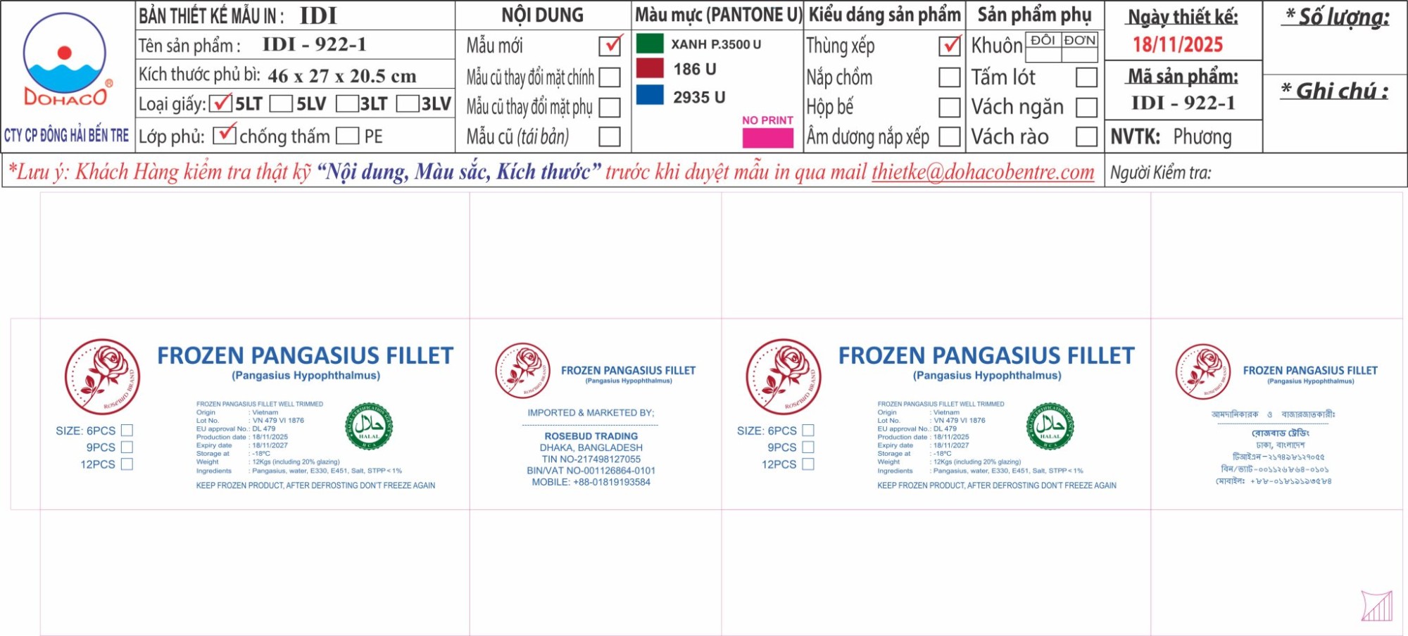 Thùng xếp, giấy trắng 5 lớp, chống thấm 2 mặt, in Flexo, thùng FROZEN PANGASISU FILLET, Logo HOA HỒNG KT: 46 x 27 x 20.5 cm, 3kg x 4, net 70%, 6pcs, 9pcs MS: 922-1 |