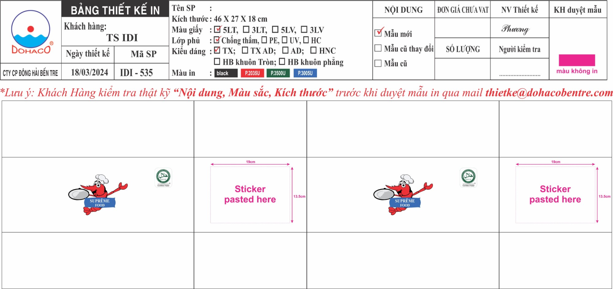 Thùng xếp, giấy trắng 5 lớp, chống thấm 2 mặt, CHẤT LƯỢNG TỐT, in flexo, logo SUPRÊME FOOD NET 70 – 1kgx10 – 4 miếng KT: 46 X 27 X 18 cm MS: 535 |