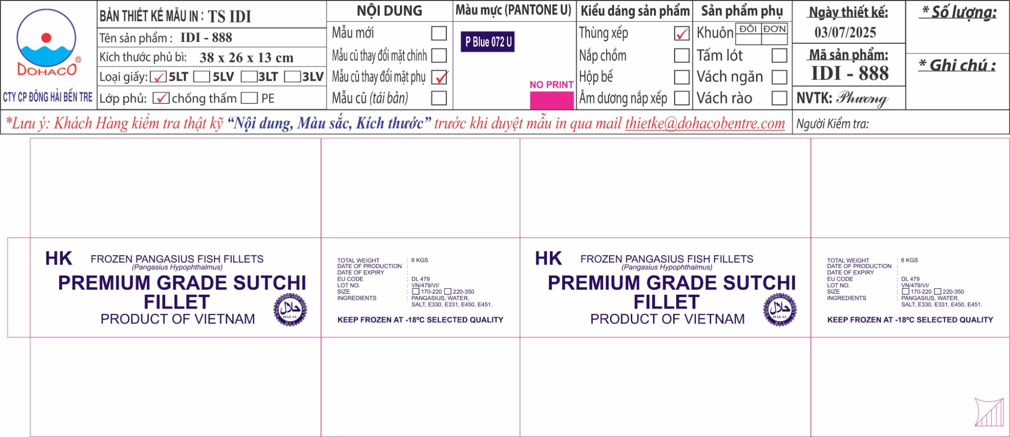 Thùng xếp, giấy trắng 5 lớp, chống thấm 2 mặt , in Flexo, Thùng logo HK (Premium … fillet) IQF, bulk 6kg, net 70%, size 170-220gr; 220-350gr Cá fillet THS MS: 888 KT: 38 x 26 x 13 cm |