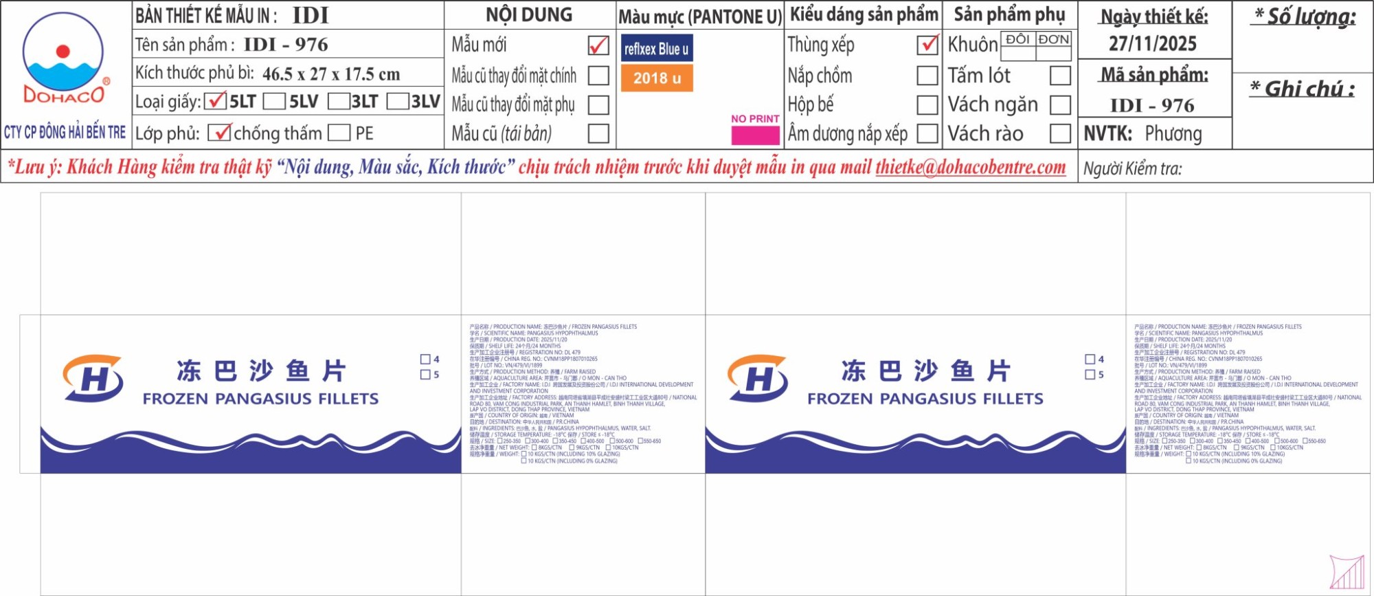 Thùng xếp, giấy trắng 5 lớp, chống thấm, CÁN MÀNG, in flexo ,Thùng FILLET – logo chữ H NET 85, NET 75% fillet THS – 2.5KG x 4 – 4pc MS: 976 KT: 46.5 X 27 X 17.5 cm |