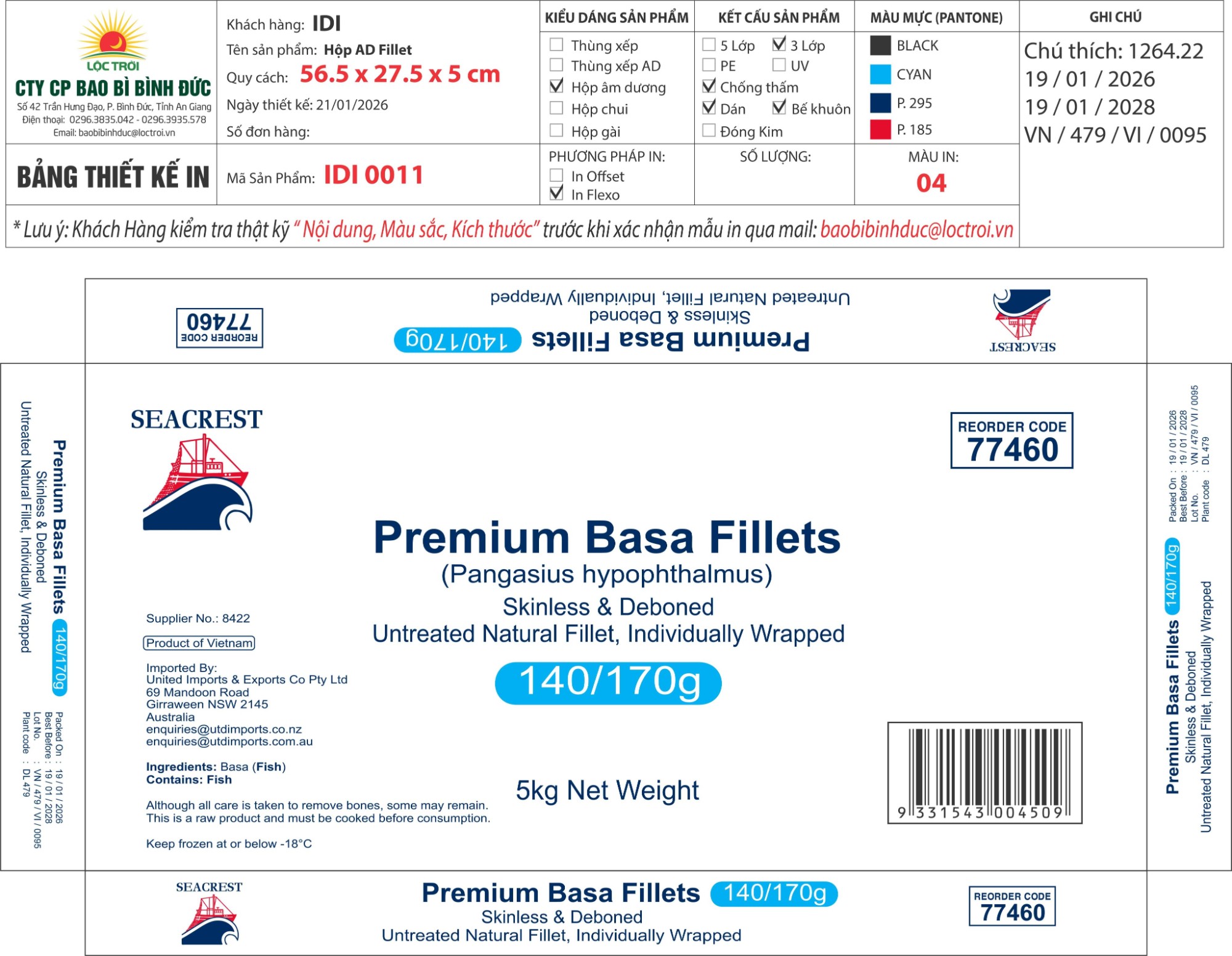 Hộp âm dương, giấy thái, nắp 3 lớp trắng chống thấm, đáy 3 Lớp trắng, chống thấm, in flexo, Hộp SEACREST SIZE 140-170, KHC, DÁN SẲN MS: 0011, KT: 56.5 X27.5 X 5