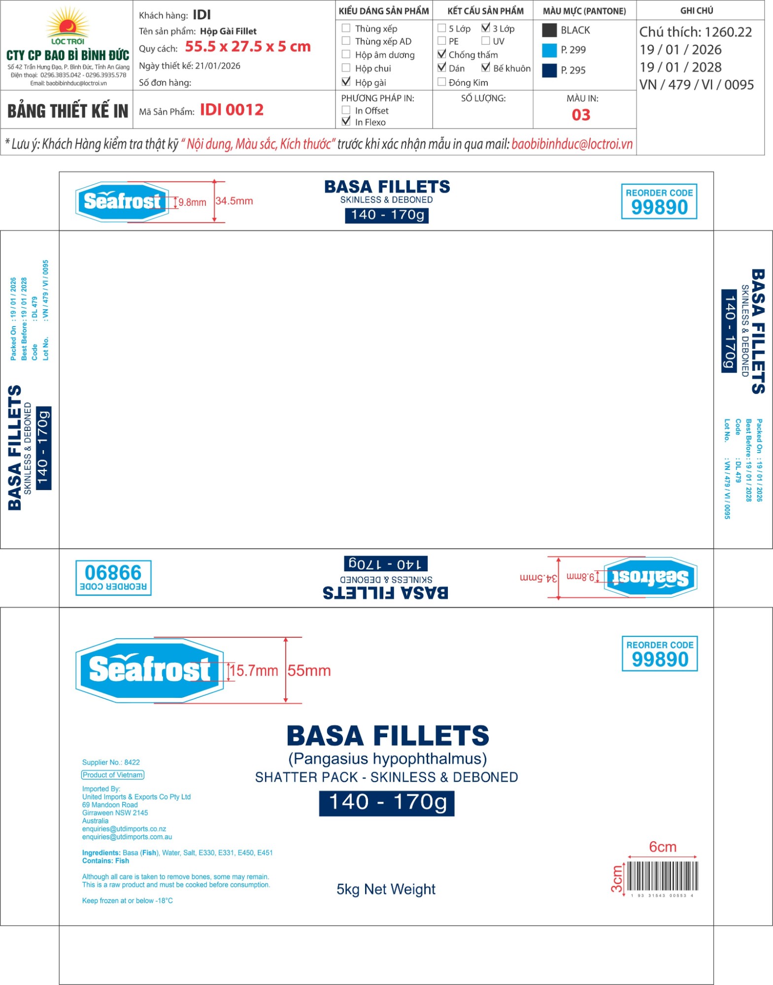 Hộp Gài, 3 Lớp trắng, giấy thái, chống thấm, in flexo, Hộp SEAFROST SIZE 140-170 TT25% MS: 0012, KT: 55,5 x 27.5 x 5