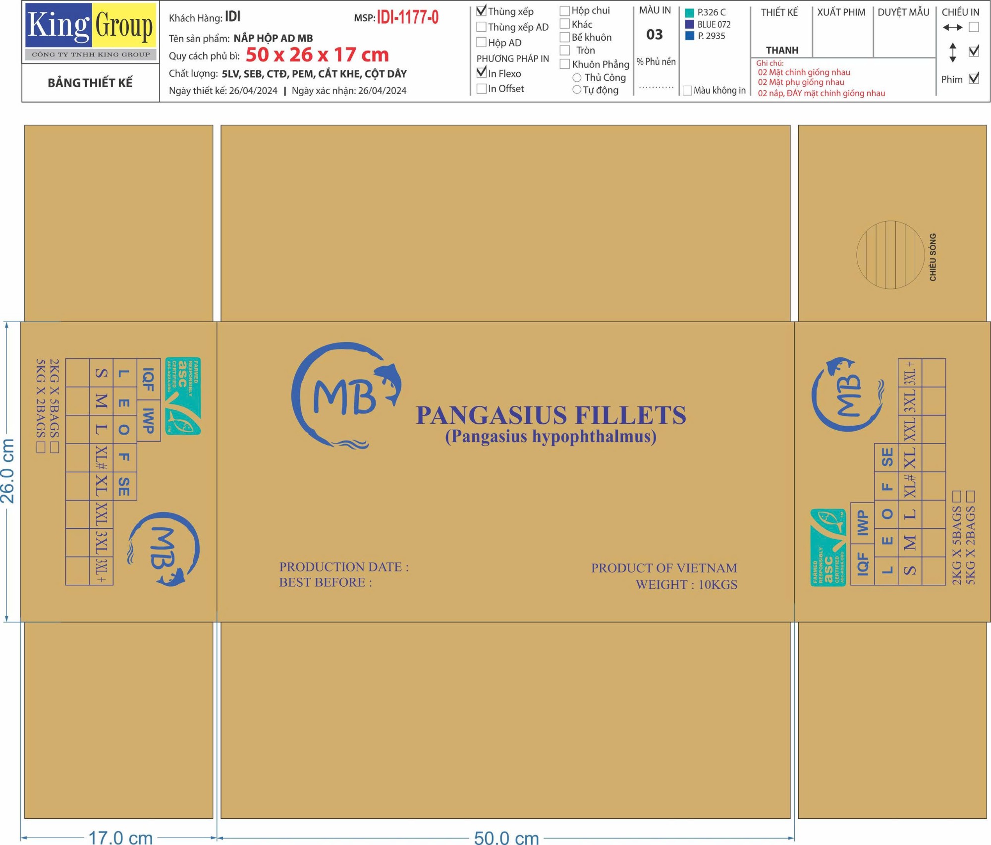 Thùng XÊP IN MÀU 5 lớp, chống thấm , CÁN MÀNG, In flexo, thùng in màu FISH FILLETS, logo MB, KT:54x27x16 cm, MS: 1176-0