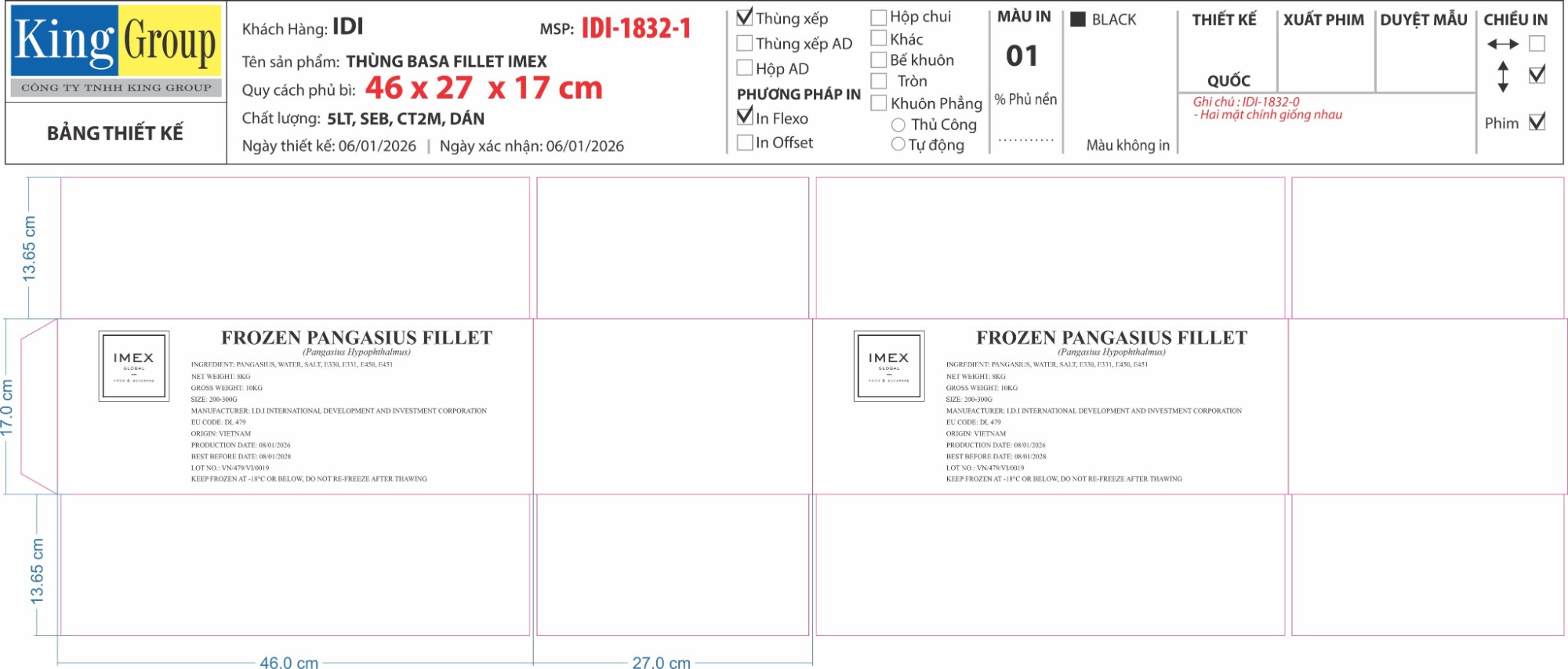 Thùng xếp, giấy trắng 5 lớp, chống thấm 2 mặt, in Flexo, KT: 46 x 27 x 17 cm, MS: 1832-1