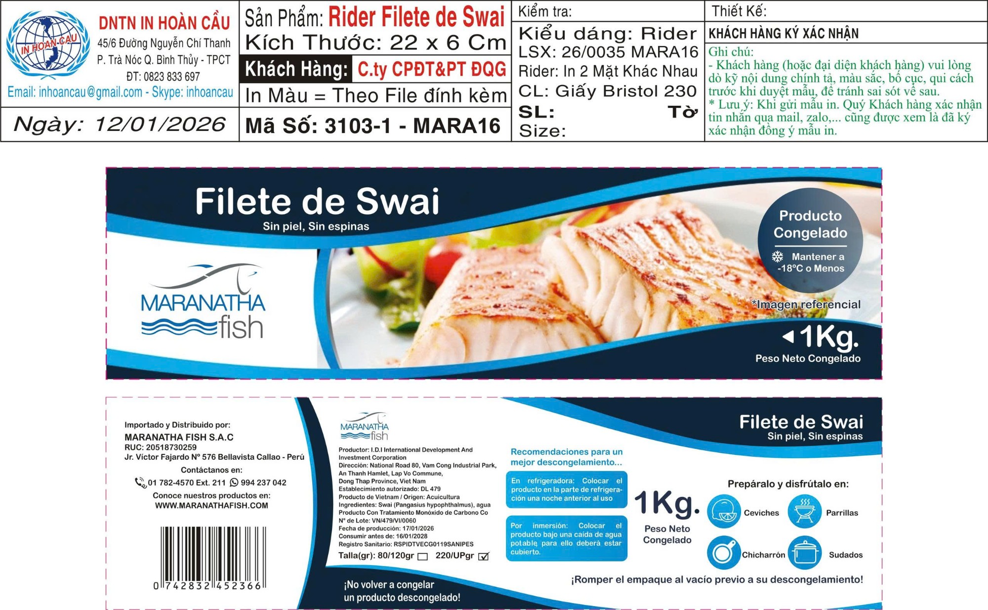 Thùng xếp, giấy trắng 5 lớp, chống thấm 2 mặt, in Flexo, Thùng logo MARANATHA Fillet 1kgx10, net 85% (2pc)-220gr-up MS: 427-23, KT: 46 x 27 x 17.5 cm