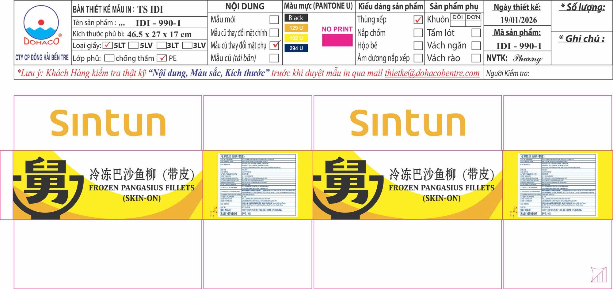 Thùng xếp, giấy trắng 5 lớp, chống thấm CÁN MÀNG in flexo, logo đen chữ tàu, SINTUN, Bulk 10kg, net 90%, cá fillet còn da KT: 46.5 X 27 X 17 cm, MS: 990-1