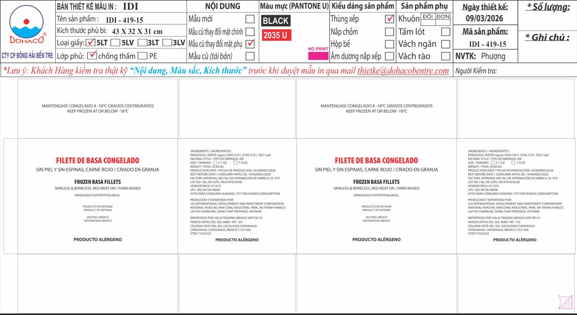 Thùng xếp trắng, 5 lớp, chống thấm 2 mặt, CHẤT LƯỢNG TỐT + CÁN MÀNG, in flexo, IQF, 20kg, 5-7; 7-9, net 78, UNtrimmed thùng FILETE DE BASA CONGELADO Ms: 419-16 KT: 43 X 32 X 31