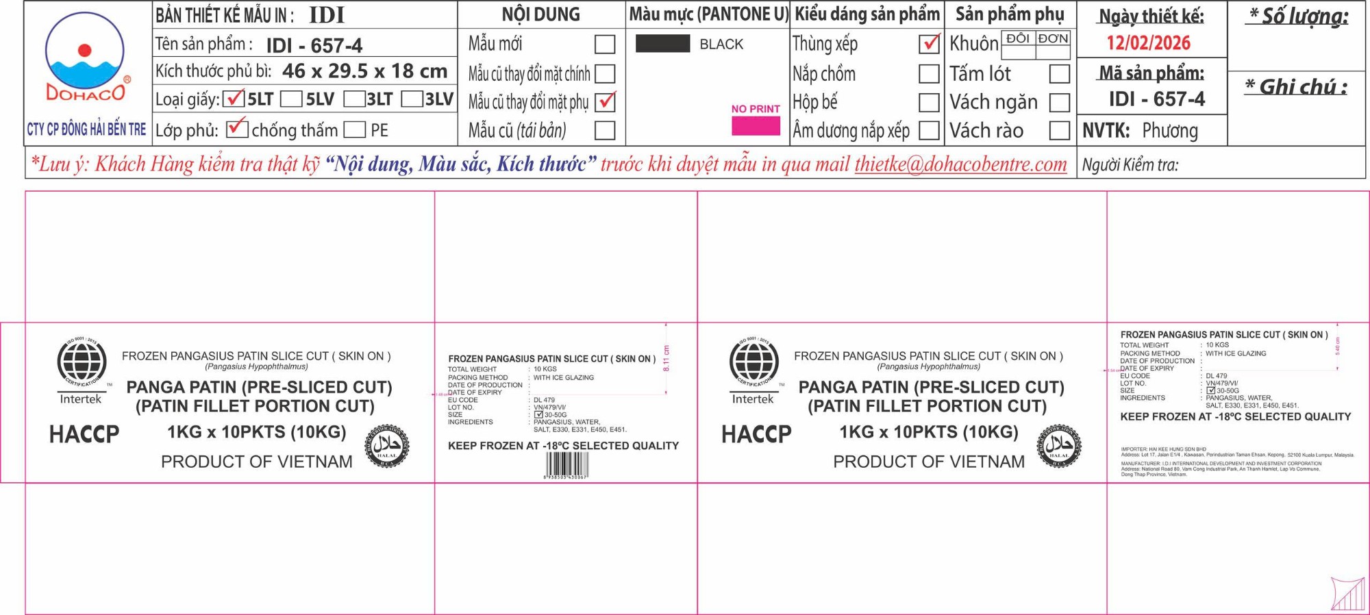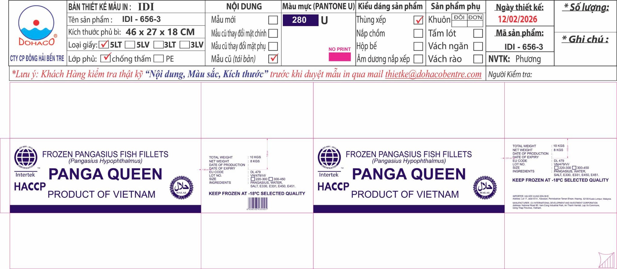 Thùng xếp, giấy trắng 5 lớp, chống thấm 2 mặt, giấy tốt, in Flexo, Thùng PANGA QUEEN, IQF, 2kgx5, net 65%, size 300-450g, Cá fillet tạo hình sạch MS: 656-3 KT: 46 x 27 x 18 cm