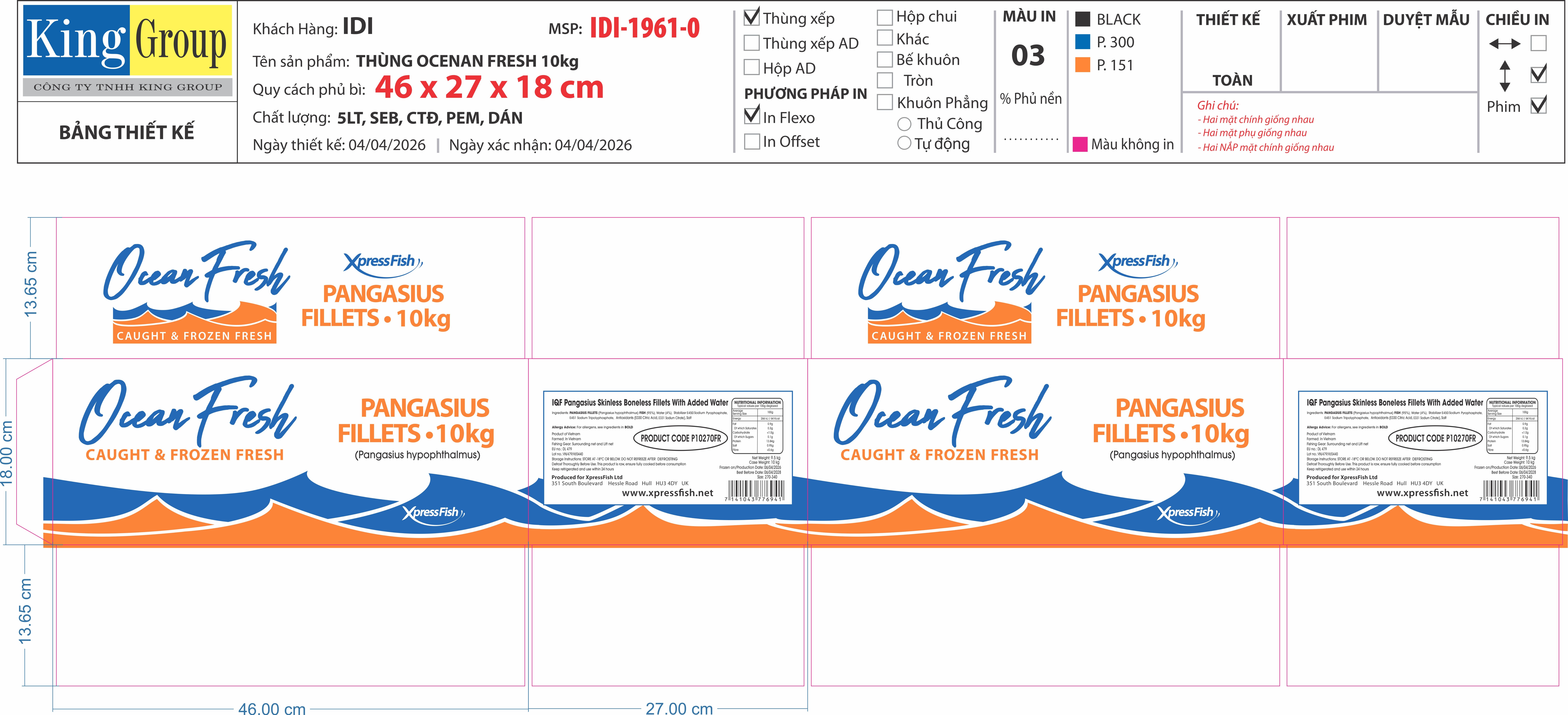 Thùng xếp trắng, 5 lớp, chống thấm, cán màng, in flexo , thùng OCEAN FRESH, BULL 10KG, NET 95, SIZE 300-350 Ms: KT: 46 x 27 x 18 cm
