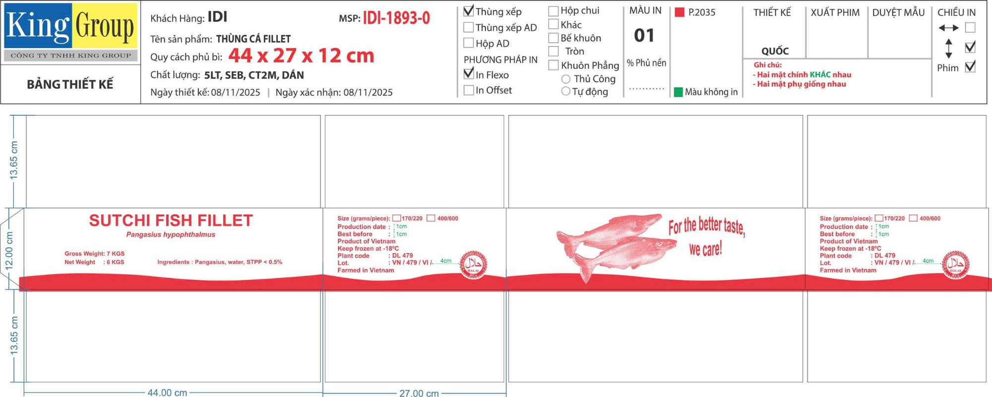 Thùng xếp, giấy trắng 5 lớp, chống thấm 2 mặt , in Flexo, Thùng SUTCHI FISH FILLET (Màu Đỏ) Thùng chất lượng tốt, IQF, 7kg gross, 6kg net75%, 2 size trên thùng 170/220, 400/600 MS: , KT: 44 x 27 x 12 cm Lưu ý: ms mới chỉ có 2 size