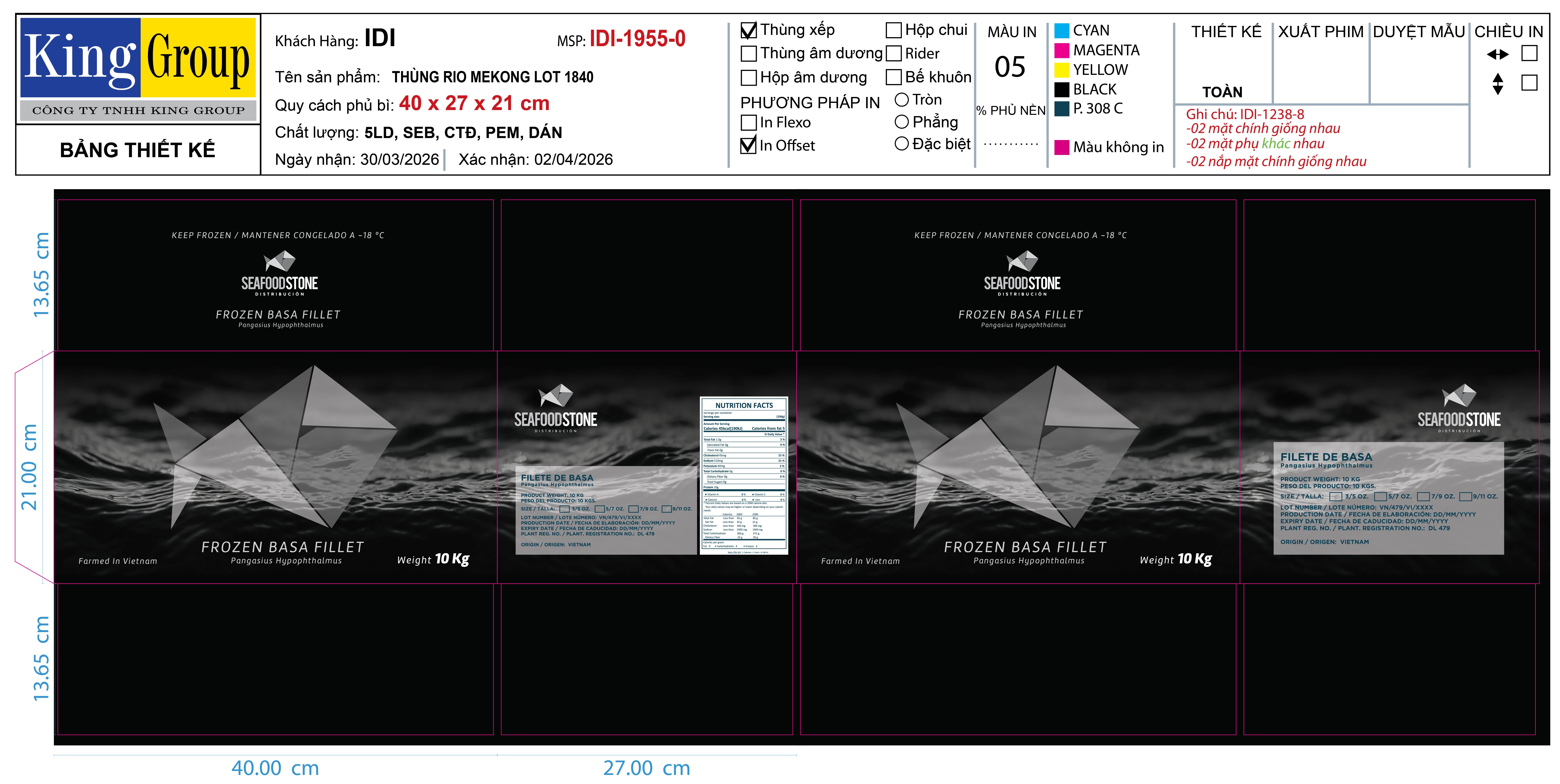 Thùng xếp, giấy trắng 5 lớp, chống thấm cán màng, in OFFSET, Thùng in nền đen, nhãn STEAK DE BASA, BULK 10KG, net 100% , size 7-9 MS: , KT: 40 x 27 x 21 cm