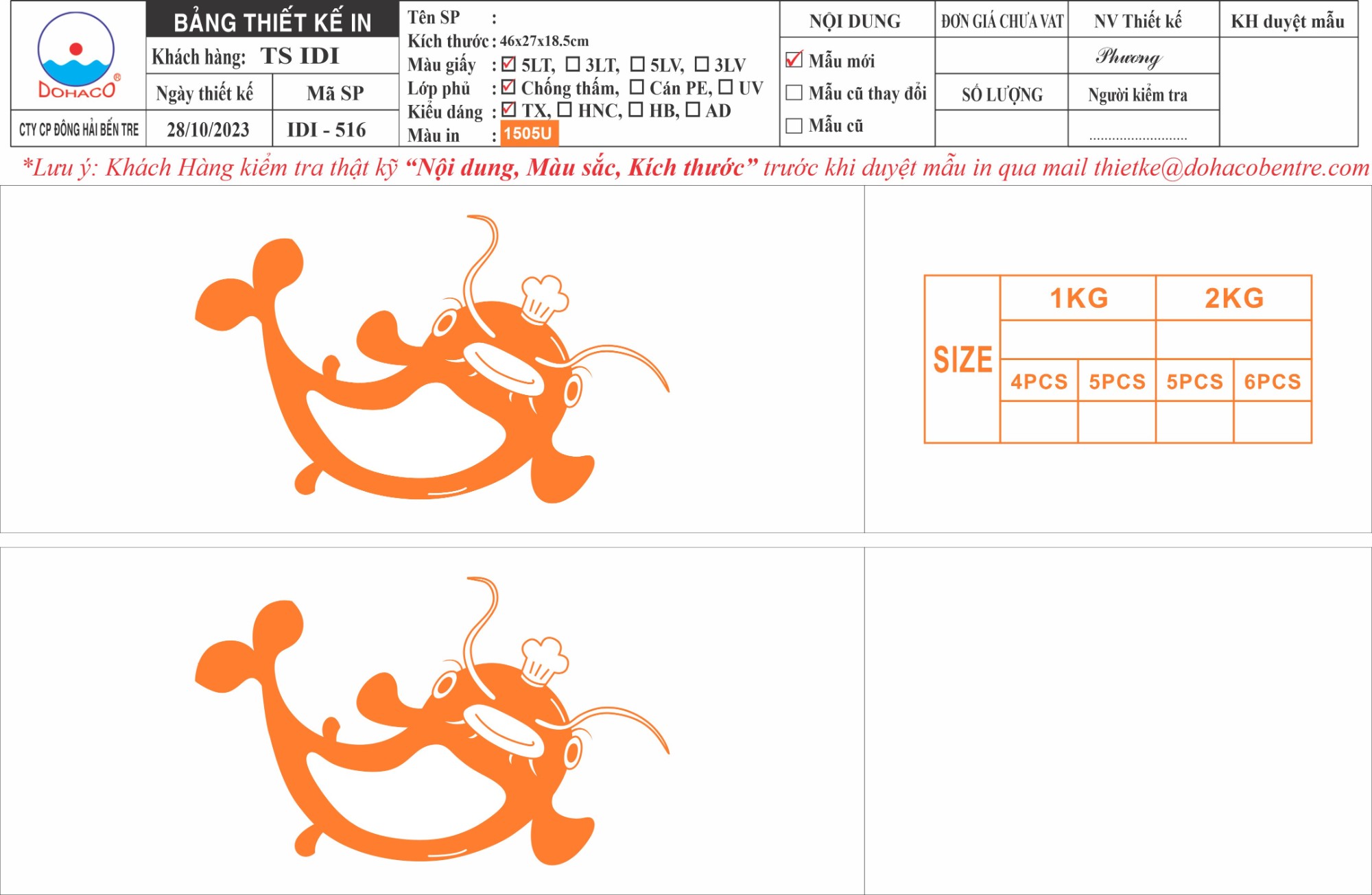 Thùng xếp trắng, 5 lớp, chống thấm 2 mặt, in flexo , thùng logo con cá màu cam, IQF, 2kg x 5, net 80%, 5 miếng, Ms: 516 KT:46 x 27 x 18 cm