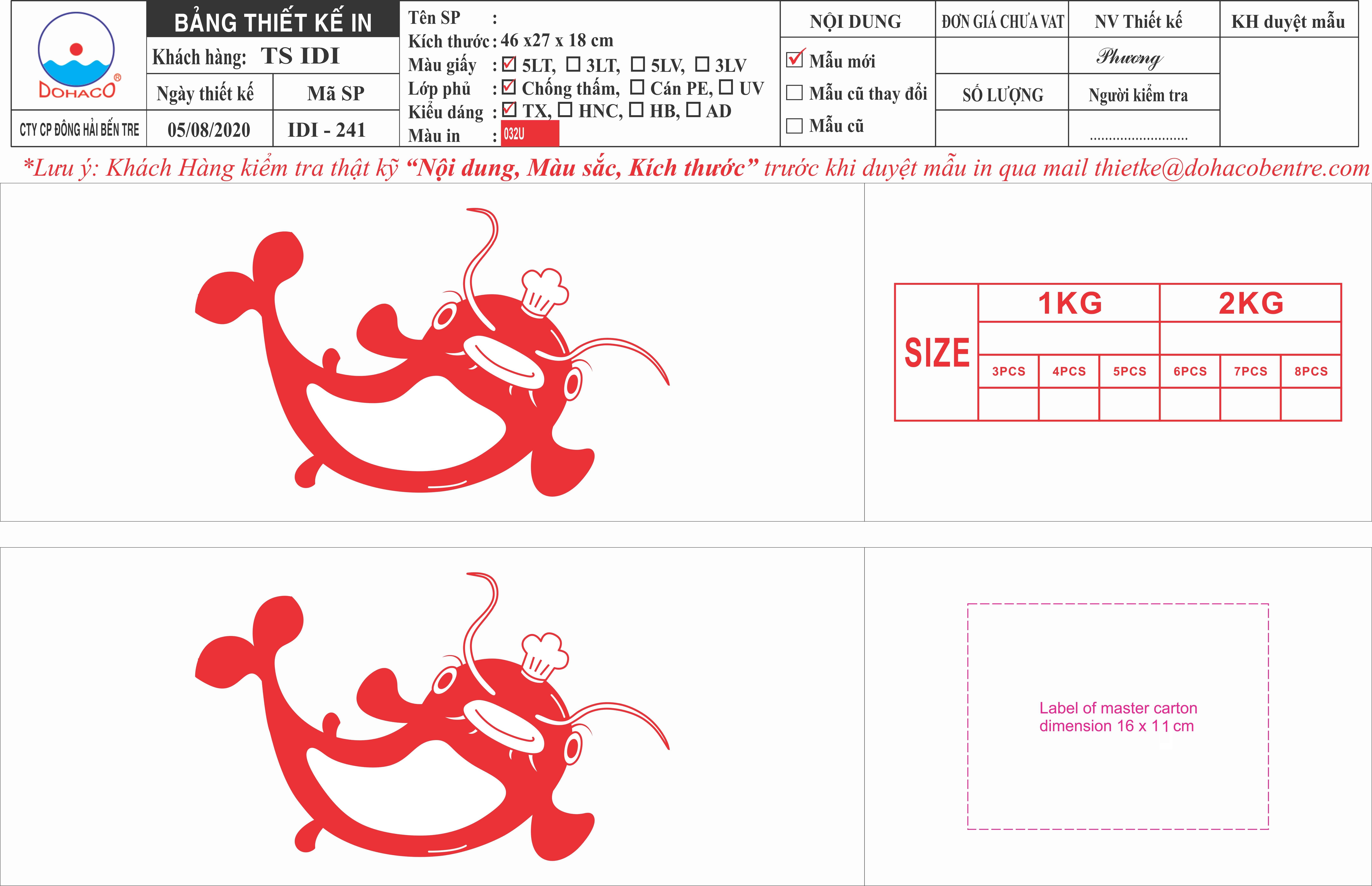 Thùng xếp trắng, 5 lớp, chống thấm 2 mặt, in flexo , thùng logo con cá Red, IQF, 2kg x 5, net 60%, 5 miếng Ms: 241 46 x 27 x 18 cm