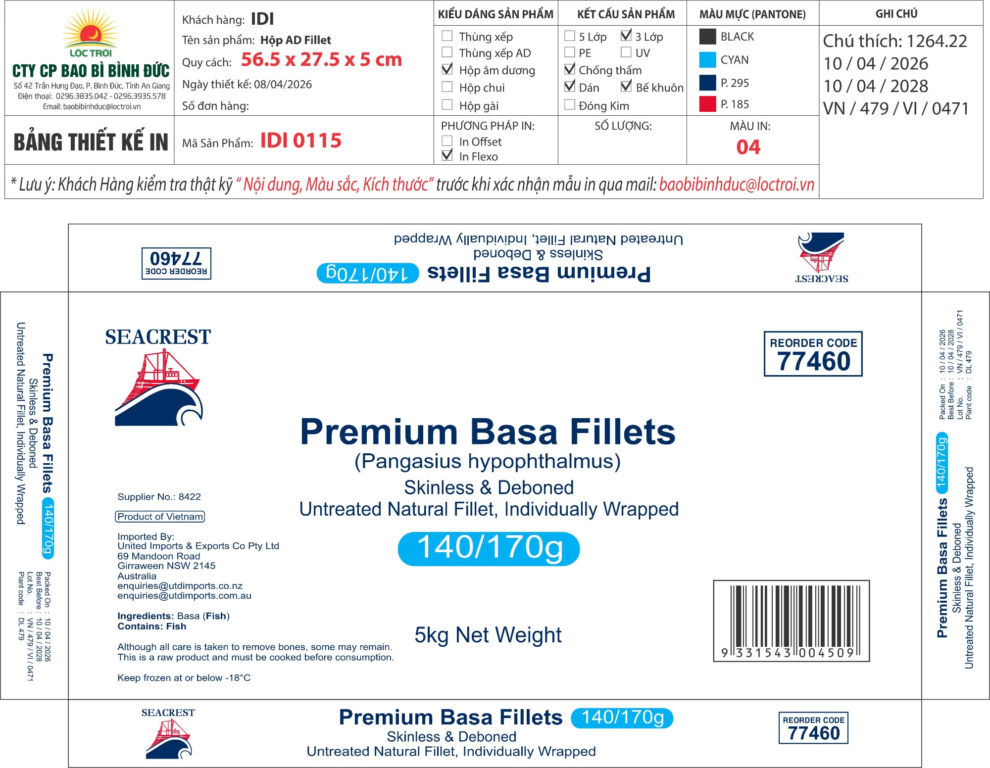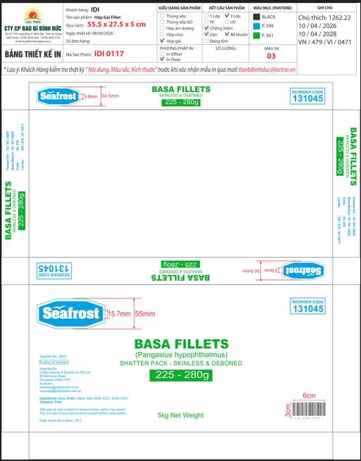 Hộp âm dương, giấy thái, nắp 5 lớp trắng chống thấm, đáy 5 Lớp trắng, chống thấm, in flexo, Hộp SEAFROST FOLDED, SIZE 120-150 TT 25% MS: IDI 0112, dán sẳn KT: 43.5X27.5X11 (KT NẮP ) – KT: 42.5X26.5X11 (KT ĐÁY ) – DÁN SẲN Chạy sóng thấp