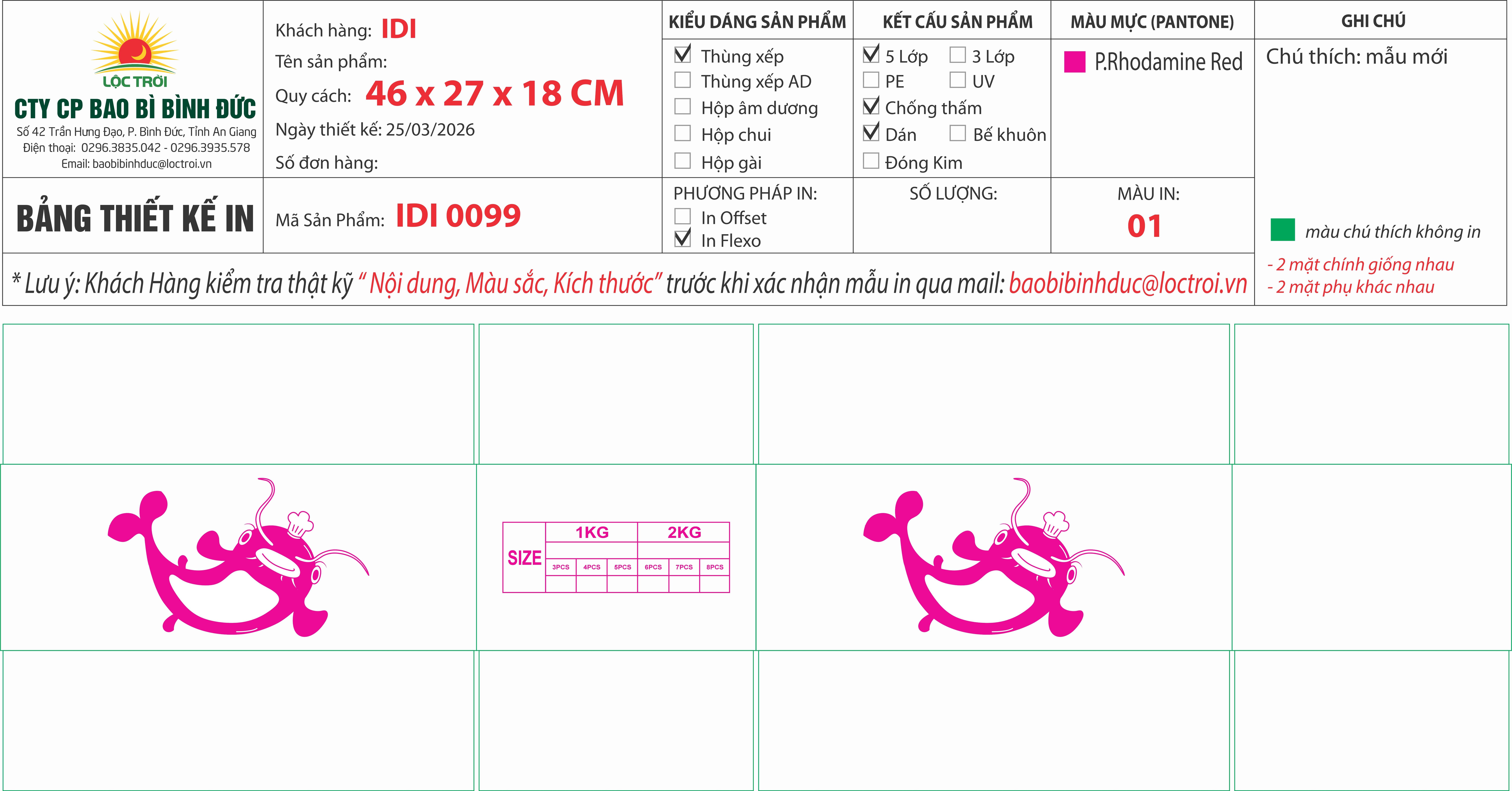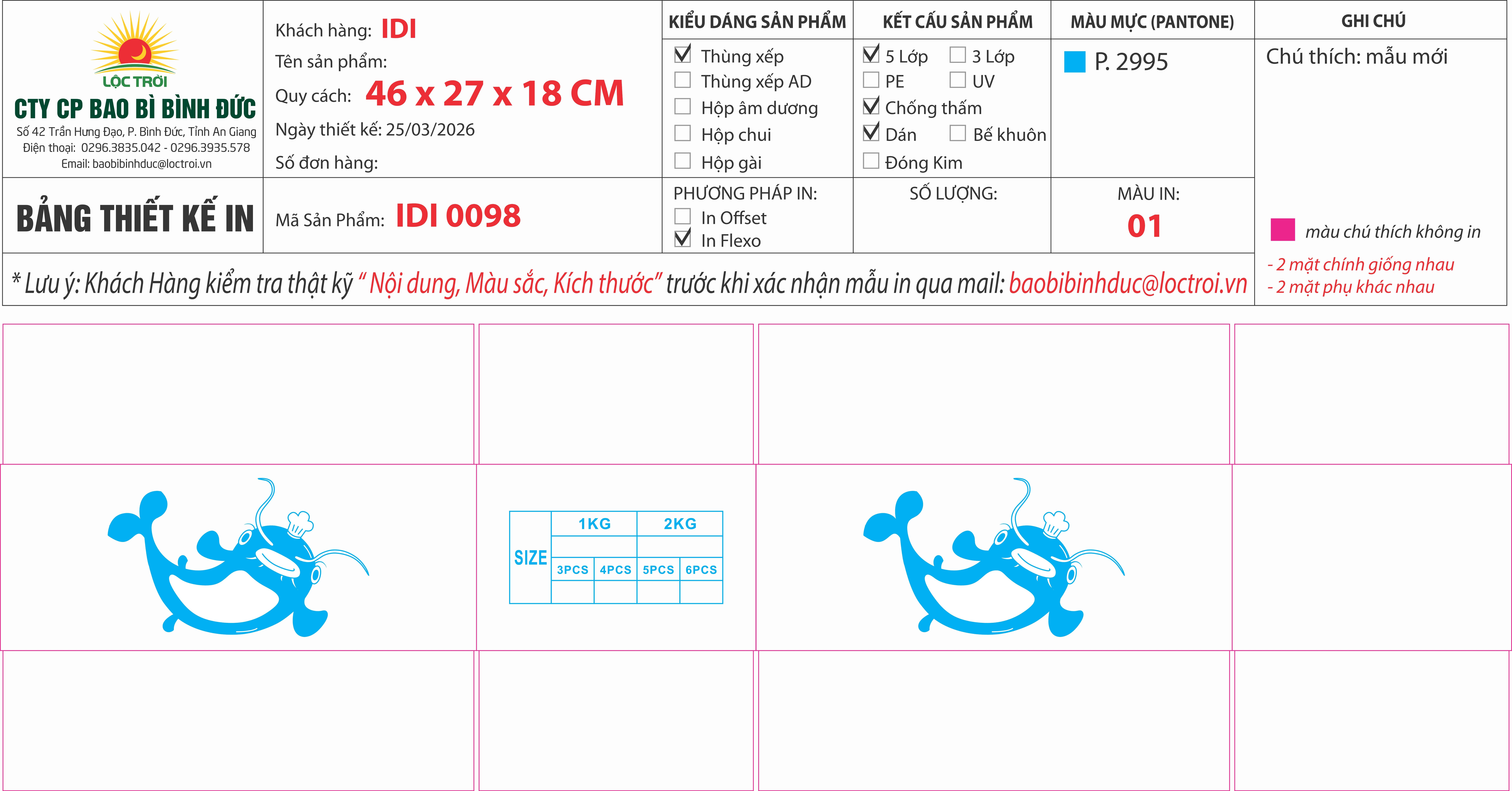 Thùng xếp trắng, 5 lớp, chống thấm 2 mặt, in flexo , thùng logo con cá hồng, IQF, 2kg x 5, net 55%, 4-6 miếng Ms: 0099 46 x 27 x 18 cm