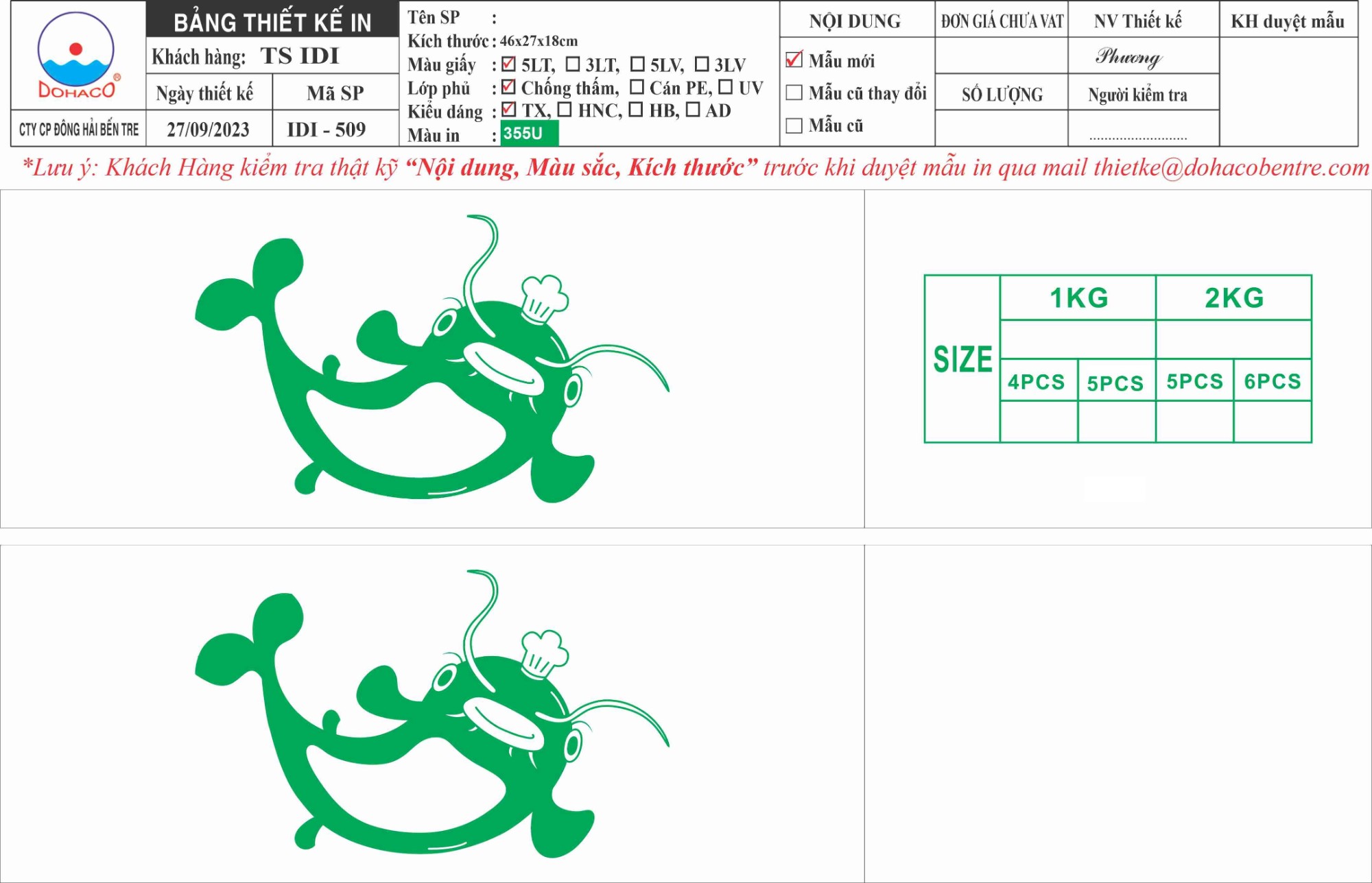 Thùng xếp trắng, 5 lớp, chống thấm 2 mặt, in flexo , thùng logo con cá GREEN, KHC,IQF, 1kg x 10, net 90%, 5miếng, Ms: 509 KT:46 x 27 x 18.5 cm