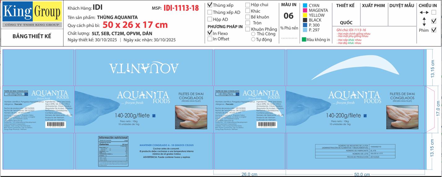 Thùng xếp, giấy trắng 5 lớp, chống thấm 2 mặt, cán OPV, in Flexo, Thùng logo AQUANITA FOOD, NỀN XANH, 1kgx10, net 80%, (5-7oz, 140-200g) MS: 1113-18 KT: 50 x 26 x 17 cm
