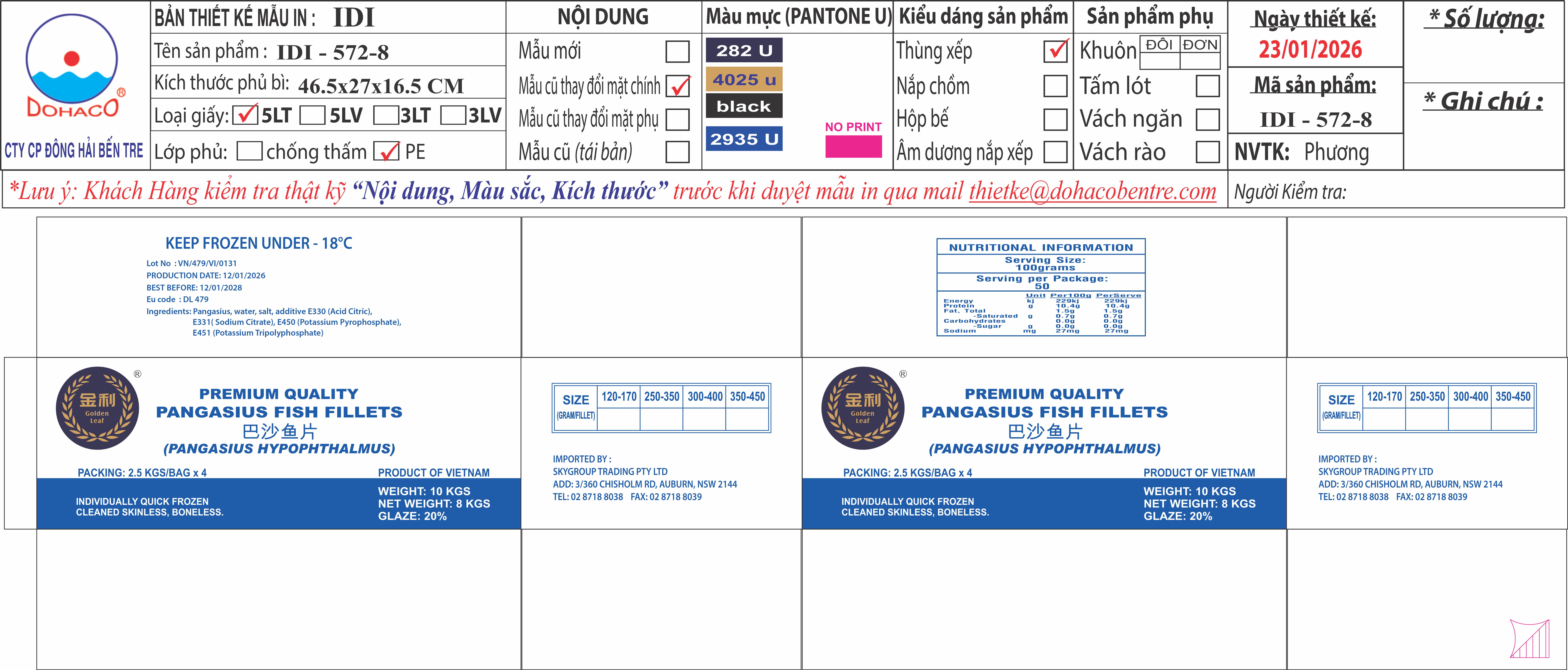 Thùng xếp, giấy trắng 5 lớp, chống thấm, cán màng chừa mép,in Flexo, Thùng PANGASIUS FISH FILLETS, 2.5kg x 4, net 80%, size 250-350 MS:572-8, KT: 46.5 x 27 x 16.5 cm