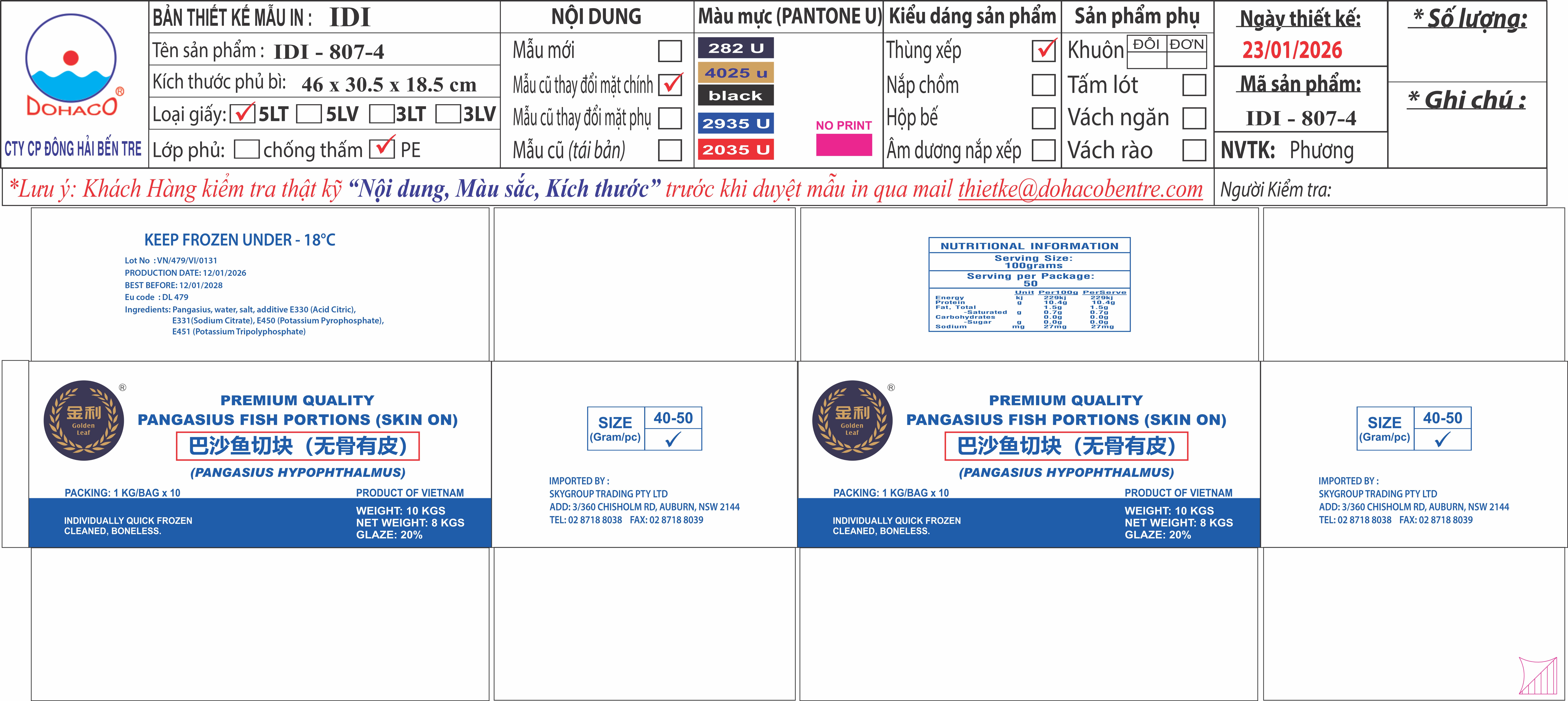 Thùng xếp, giấy trắng 5 lớp, chống thấm, cán màng chừa mép ,in Flexo, Thùng PANGASIUS FISH PORTIONS, 1kg x 10, net 80%, size 16-20pcs, 40-50 MS: 807-4, KT: 46 x 30.5 x 18.5 cm