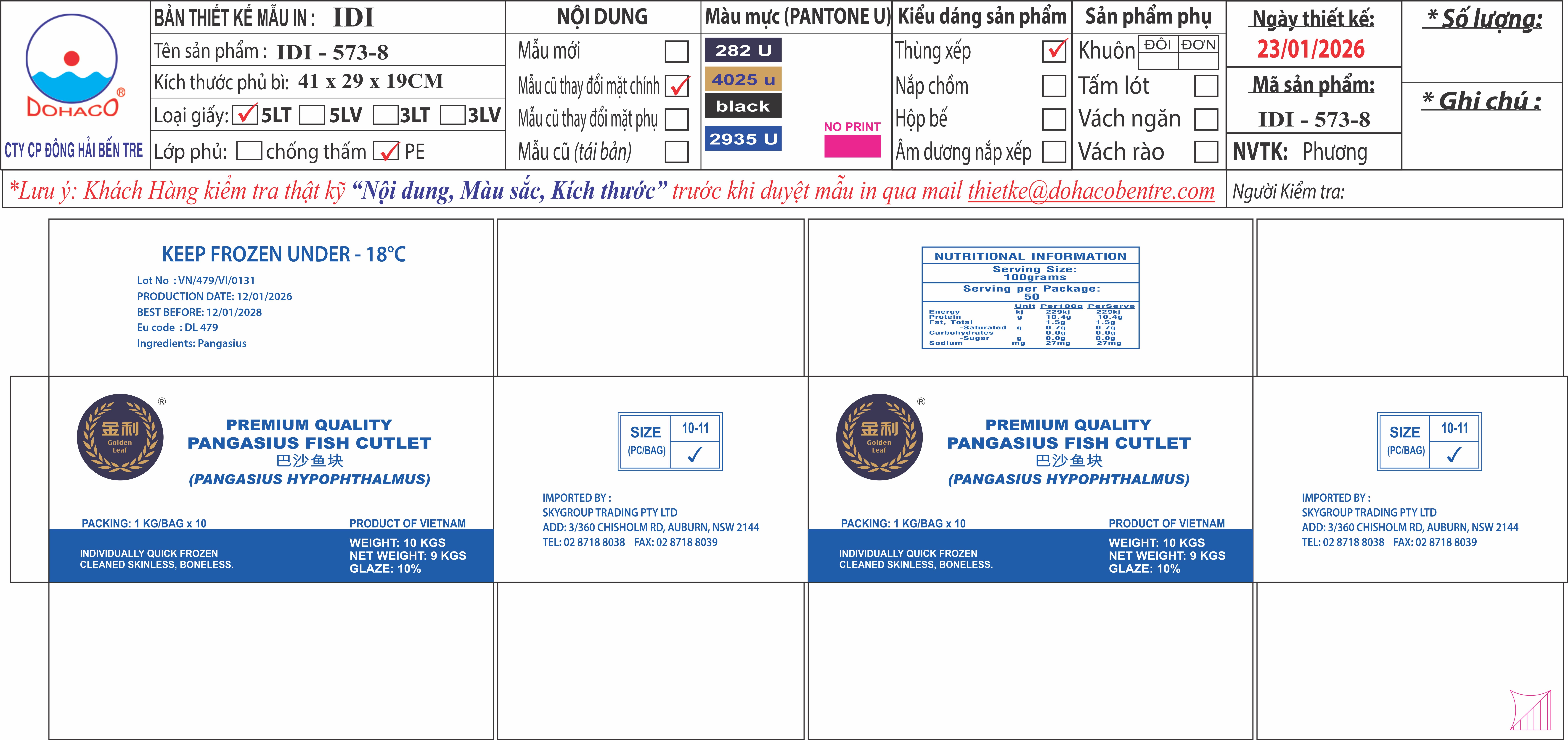 Thùng xếp, giấy trắng 5 lớp, chống thấm, cán màng chừa mép ,in Flexo, Thùng PANGASIUS FISH STEAK, 1kg x 10, net 90%, size 10-11 pcs MS: 573-8, KT: 41 x 29 x 19 cm