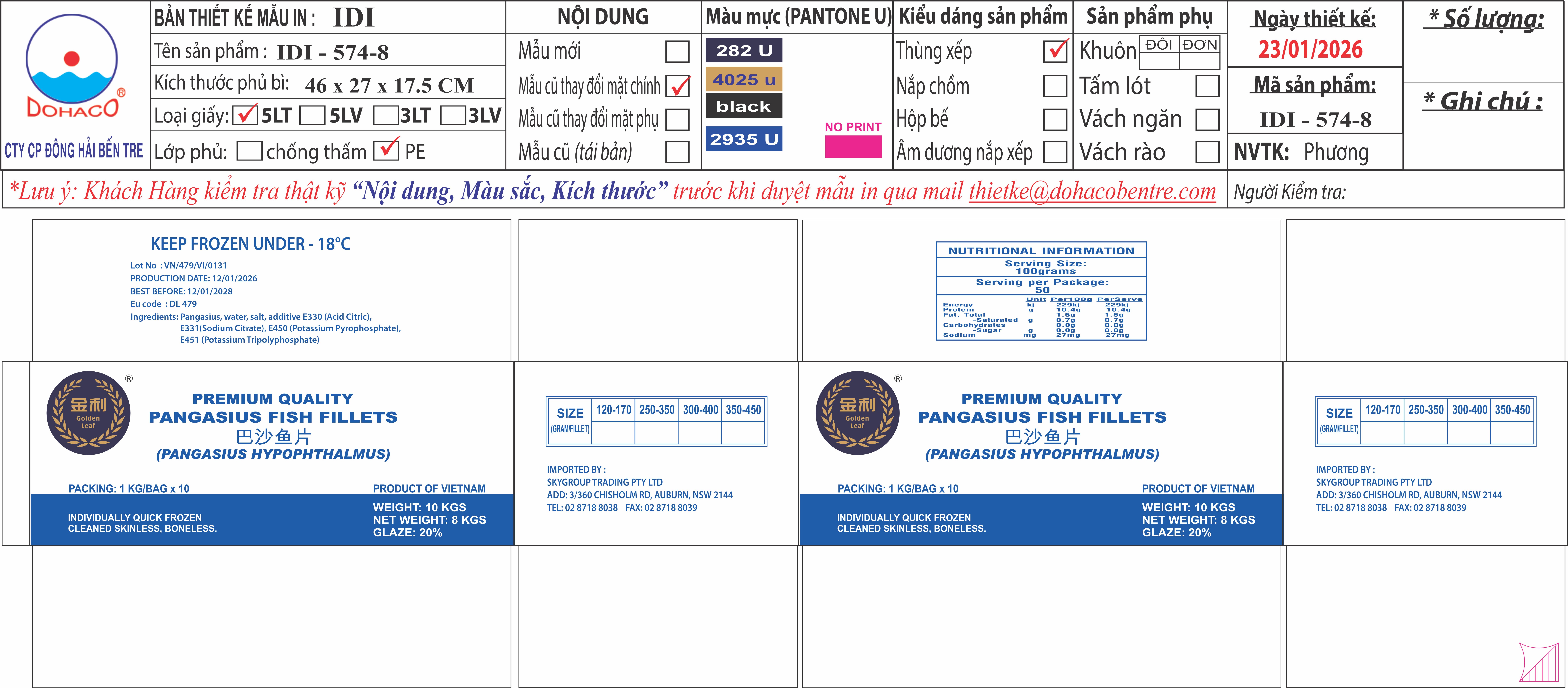 Thùng xếp, giấy trắng 5 lớp, chống thấm, cán màng chừa mép, in Flexo, Thùng PANGASIUS FISH FILLETS, 1kgx10, net 80%, size 250-350, 3pcs MS: 574-8, KT: 46 x 27 x 17.5 cm