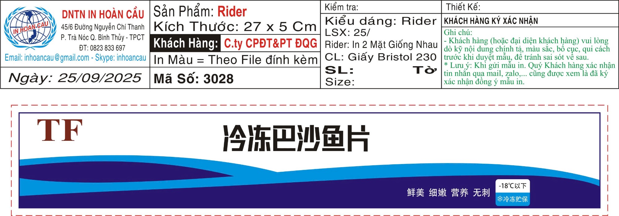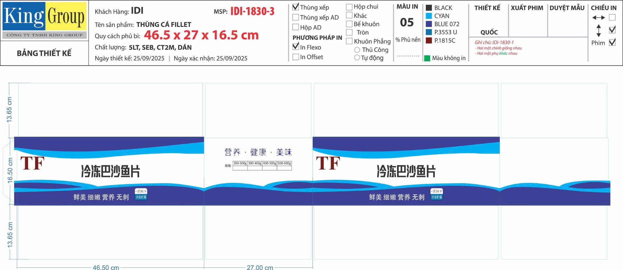 Thùng xếp, giấy trắng 5 lớp, chống thấm 2 MẶT, in flexo, thùng logo TF mới, NỀN BLUE KT: 46.5 x 27 x 17 cm (Cá fillet CÒN DA– net 86.96-70.65% - 5pc–2.30kgx4) MS: 1830-3