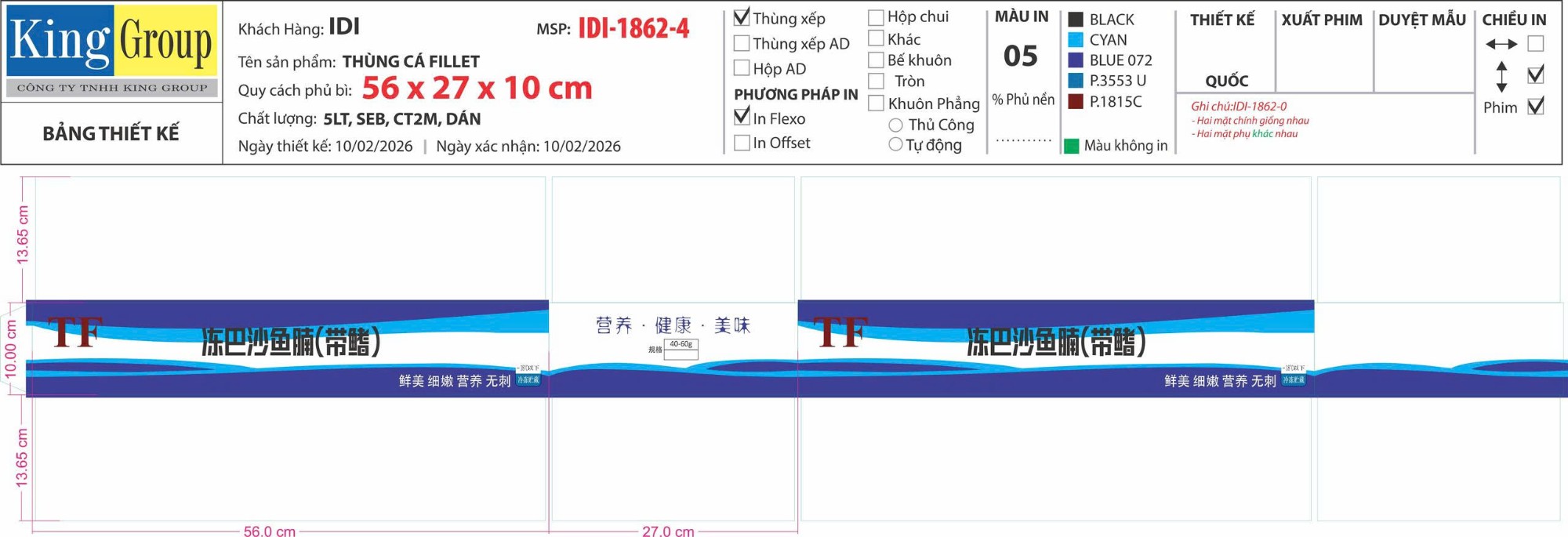 Thùng xếp, giấy trắng 5 lớp, chống thấm 2 MẶT, in flexo, thùng logo TF mới, NỀN BLUE KT: 56 x 27 x 10 cm (VÂY ỨC CÁ – net 60% - 40-60g –block 5kgx2) MS: 1862-4