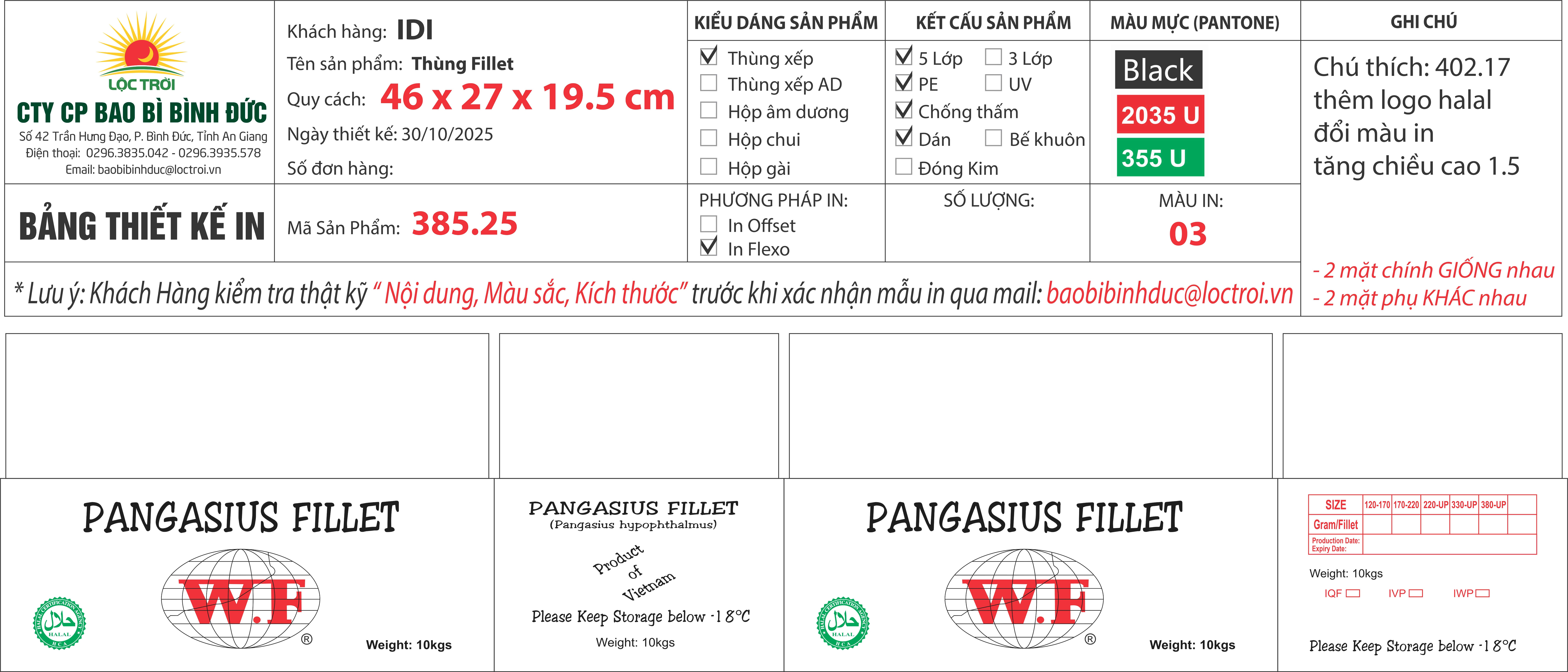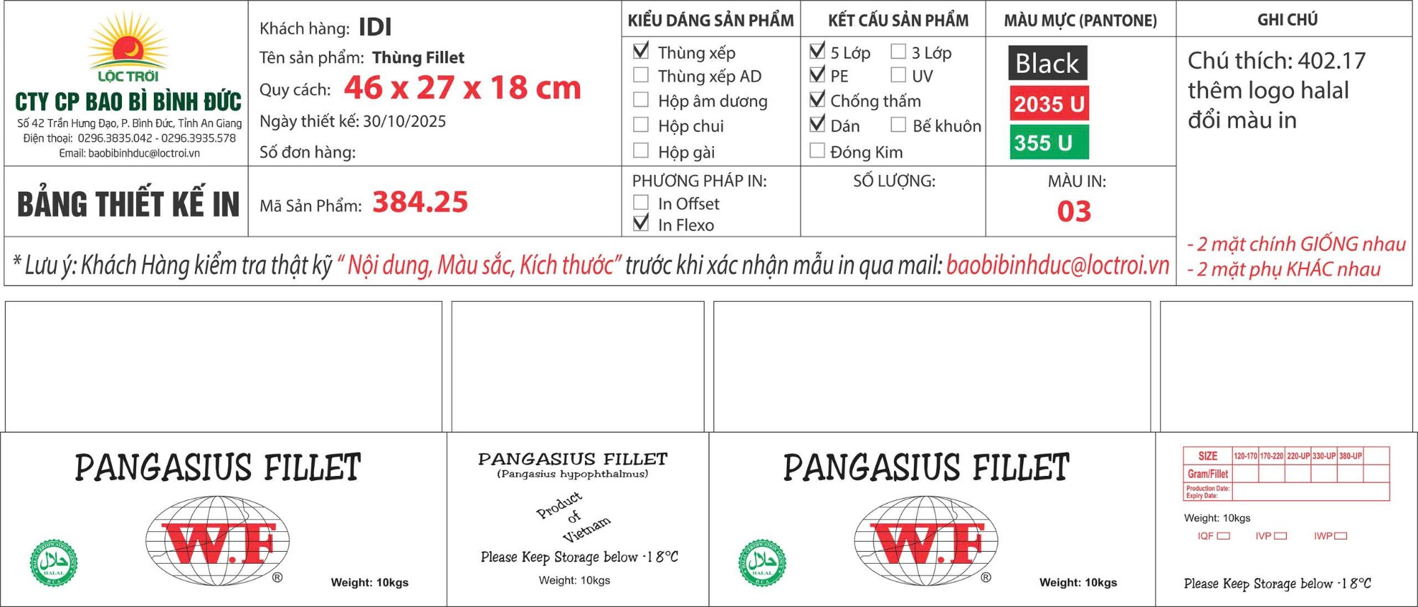 Thùng xếp, giấy trắng 5 lớp, chống thấm, CÁN MÀNG, in Flexo, Thùng PANGASIUS FILLET,có logo Halal KT: 46 x 27 x 18 cm, MS: 384.25